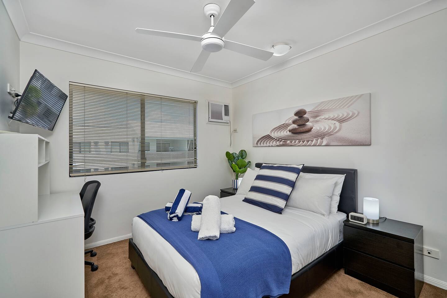Located in the secure Retreat on Pease complex in Manoora, this top-floor apartment offers resort-style comfort close to Cairns City. Ideal for families and couples, it features two bedrooms (queen and double) plus a fold-out bed, a private balcony overlooking the pool, fast Wi-Fi, air-conditioning, a full kitchen, laundry and free secure parking. A relaxed tropical stay just minutes from the Cairns Esplanade, Great Barrier Reef tours and local dining.